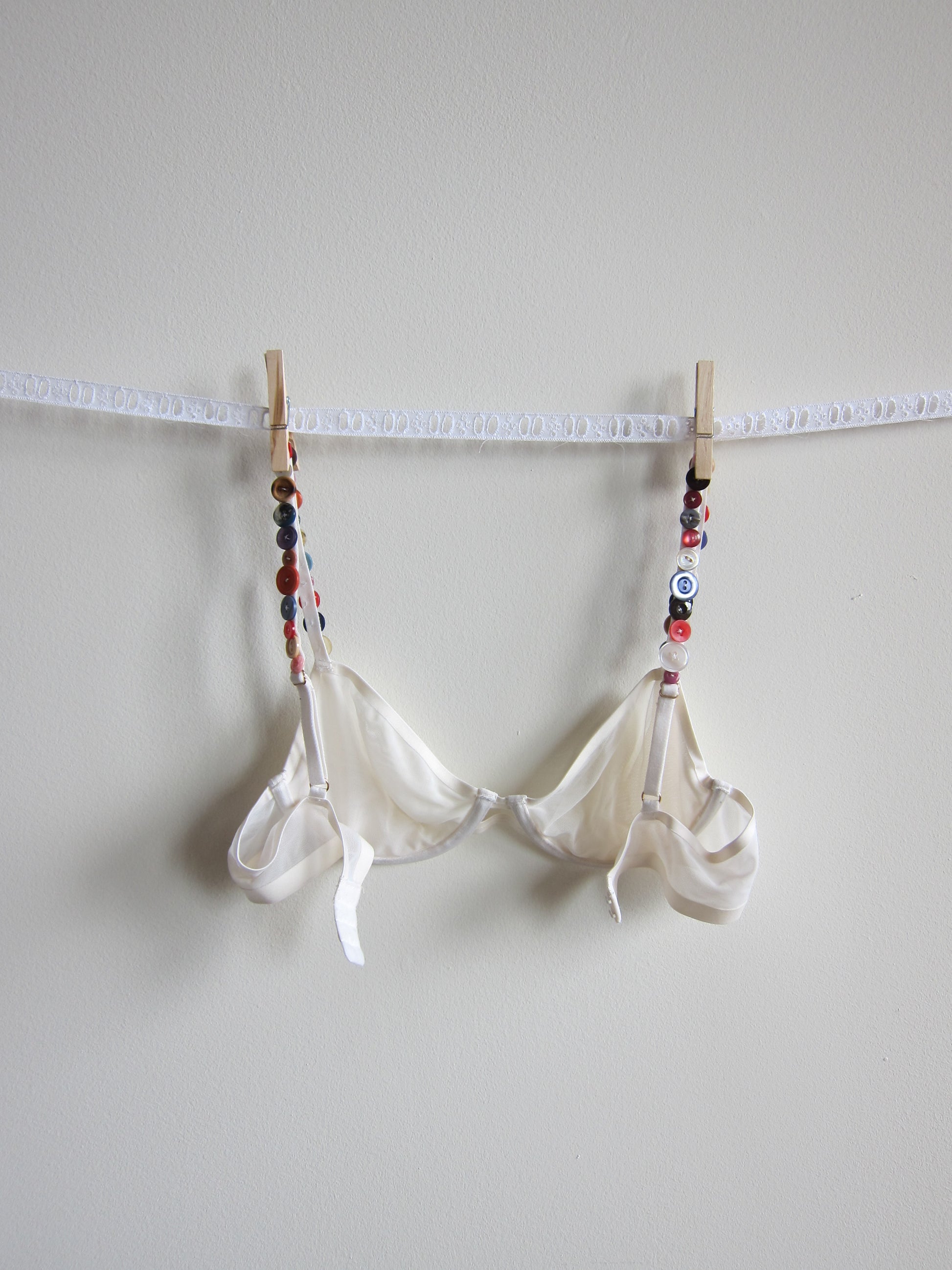 a one-off sheer balconette bra, hand-adorned with buttons gathered from my collection—pieces inherited, salvaged, and left behind from past projects